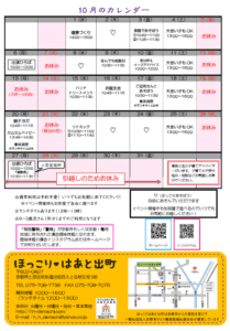 ほっこりはあと出町は移転することになりました。10月土曜日の午後は年齢フリーで3才以上のお子さんも遊びにきてもらえます!皆さんお顔見せに来てくださいね。お待ちしております。